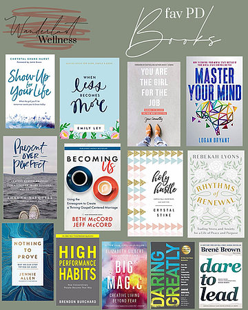 Show Up for Your Life // When Less Becomes More // You are the Girl for the Job // Master Your Mind // Present Over Perfect // Becoming Us // Holy Hustle // Rhythms of Renewal // Nothing to Prove // High Performance Habits // Big Magic // Daring Greatly // Dare to Lead