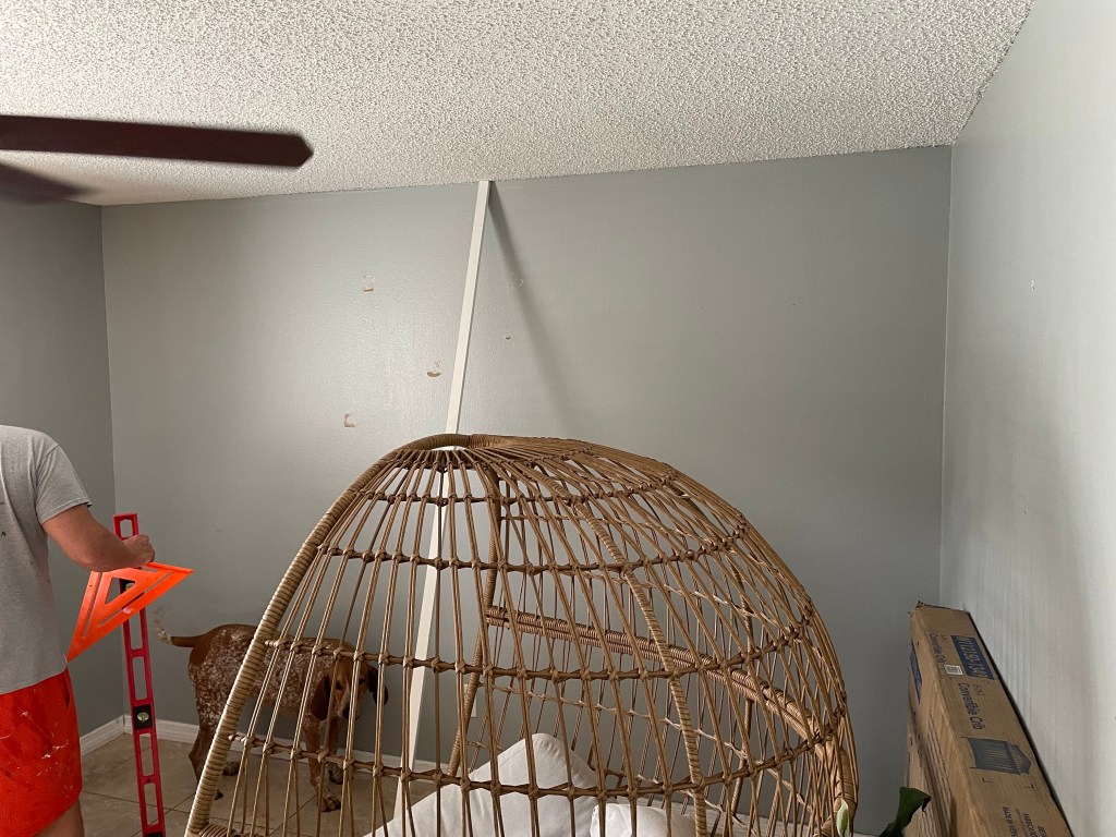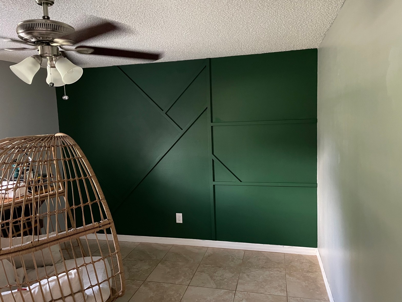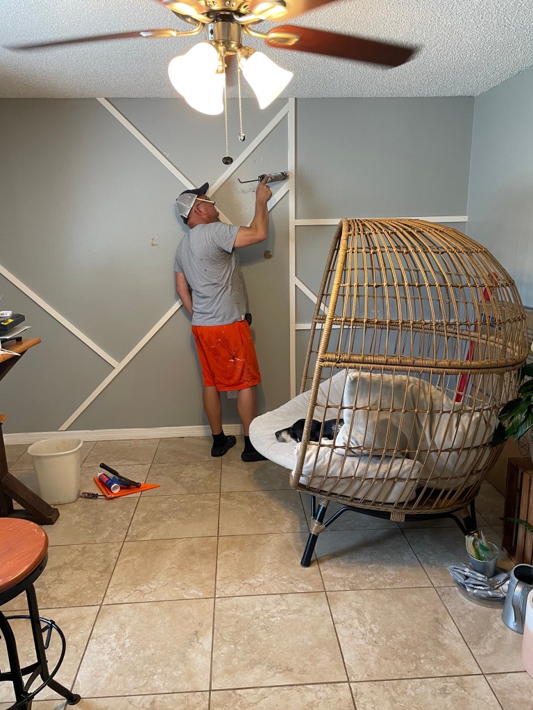 If you didn’t know this already, my dad is SUPER talented, so I knew we would be able to figure it out pretty easily. All we did was add some wood (1×2 primed pine trim boards) to the wall of our choice in a pattern. Dad basically started with the off centered straight up & down one. From there, he worked at 45 degree angles to the left and 90 degree angles to the right. He always says to measure twice and cut once. He did this with each wood piece & then cut it with his table saw. He just hammered nails in, but you could definitely use a nail gun if you were putting up multiple pieces or doing a large wall. I will post some pictures of the process below.